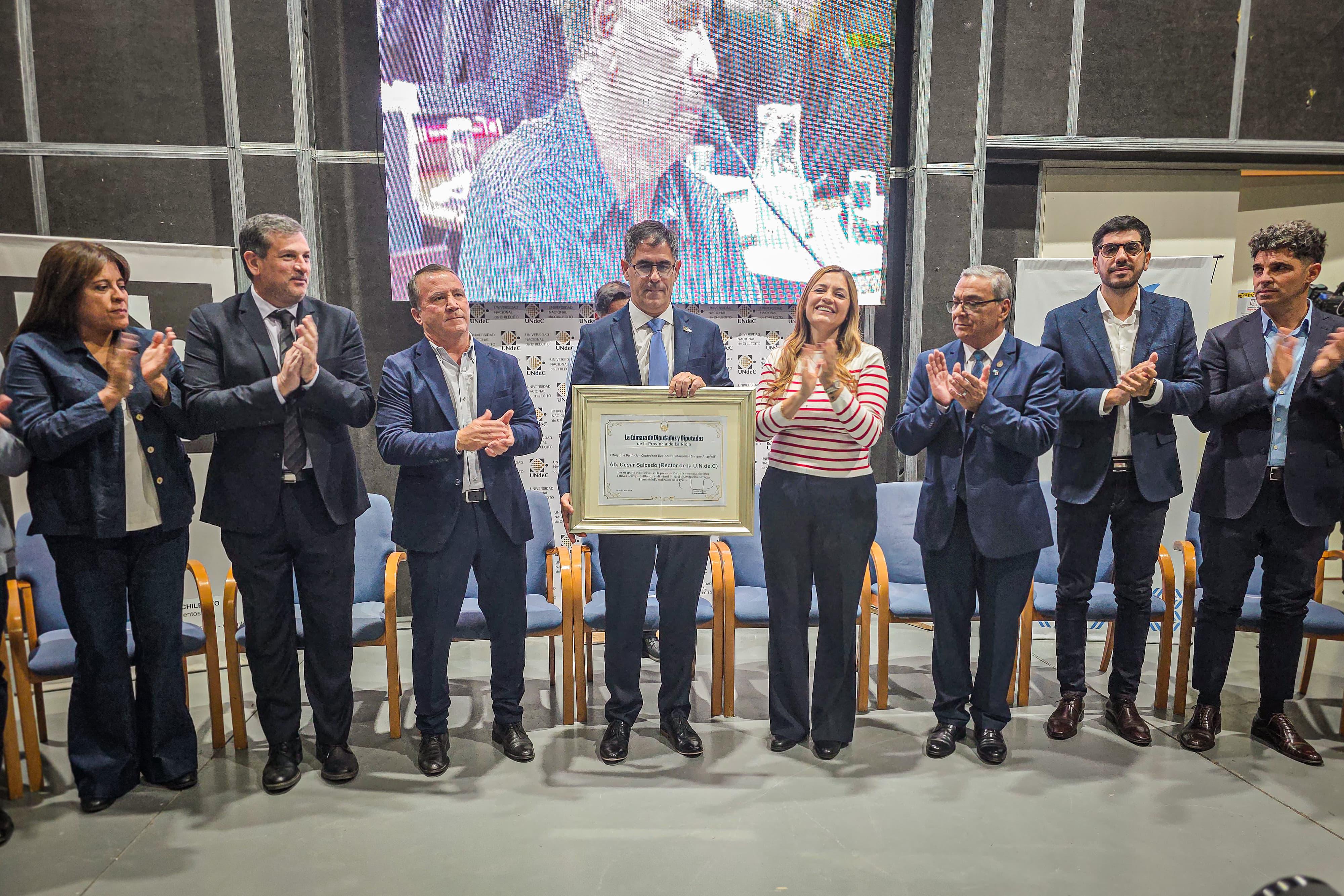 El rector de la Universidad Nacional de Chilecito, César Salcedo, fue distinguido por la Legislatura Provincial con el reconocimiento “Monseñor Enrique Angelelli” por impulsar una tarea fundamental: preservar el único archivo audiovisual de los juicios por delitos de lesa humanidad en La Rioja.
